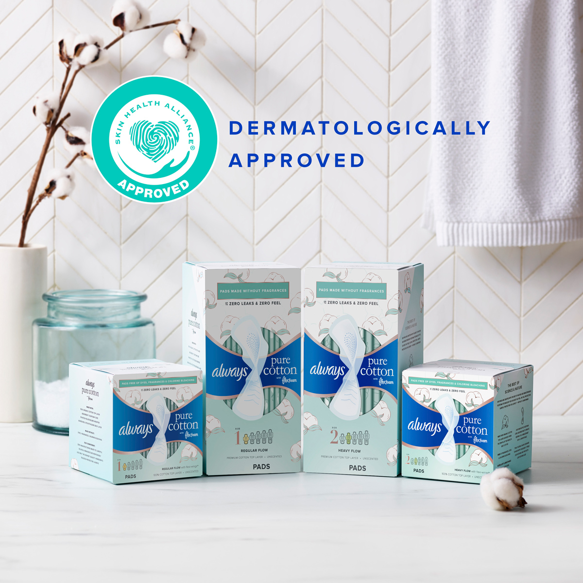 Always Pure Cotton with Flexfoam menstrual pads have been dermatologically tested, and approved as skin-friendly by the Skin Health Alliance, an independent organization led by dermatologists and scientists. The qualification process includes an assessment of the ingredients, and clinical trial data. Always FlexFoam products have been endorsed by the SHA for several years and we will continue working with professionals to ensure our products meet high external standards.